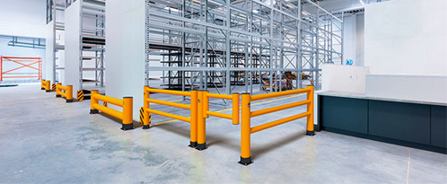 Elastyczne bariery i odboje śą wytrzymałe, łatwe w montażu. Przeznaczone do oddzielenia ruchu pieszego, dróg transportowych wózków przemysłowych, zabezpieczenie regałów magazynowych i bram.