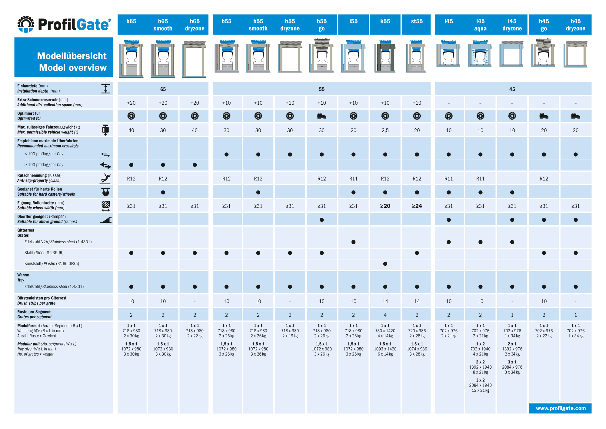 Wersja b65 posiada wannę o wysokości 65 mm co pozwala na zwiększenie ilości zbieranych zanieczyszczeń. Kratownice te można montować tylko w fundamencie. Segmenty ProfilGate, składają się z galwanizowanej ogniowo spawanej kratownicy, rynny zbiorczej ze stali nierdzewnej oraz opatentowanych szczotek. Standardowym kolorem szczotek jest niebieski. System przeznaczony do 100 przejazdów dziennie. Jako uzupełnienie czyszczenia można zastosować strefy DryZone, w których koła wózka są doczyszczane lub dosuszane na kratownicach z nakładkami z mikrofibry. Długość pola czyszczącego decyduje o intensywności usuwania brudu. Optymalna długość pola powinna wynosić 3 do 4 długości obwodu opony. Wymagane minimum, to dwa obroty.