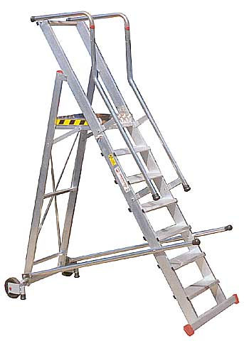 Drabina aluminiowa z barierkami i platformą roboczą. Stelaż drabiny stanowią kształtowniki o profilu zamkniętym. Podest wykonany jest z blachy ryflowanej. Drabina wyposażona jest w dwa koła (możliwość zastosowania dodatkowych kół). Wymiary podstawy drabiny uzależnione są od wysokości konstrukcji. Udźwig 150 kg. Konstrukcja umożliwia złożenie i wygodne przechowywanie.