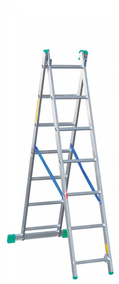 Drabiny aluminiowe, szczeblowe z rowkami antypoślizgowymi przystosowane do pracy w oparciu o np.: ścianę lub jako wolnostojące. Zastosowanie szerokiej belki przy podstawie zapewnia stabilność przy pracy na dużej wysokości. Rowkowane zaślepki z tworzywa zabezpieczają końce drabiny przed poślizgiem i nie niszczą podłogi.