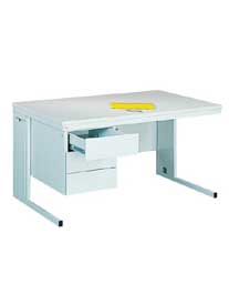 Stelaż biurka wykonany z profili stalowych zamkniętych o przekroju czworokątnym. Stopki z możliwością regulacji. Blat z powłoką z melaminy o grubości 25 mm. Noga biurka w kształcie litery "L". W wyposażeniu biurka stosowane są szuflady standardowe lub przystosowane do przechowywania teczek zawieszkowych A4. Szuflady mocowane są na prowadnicach kulkowych i blokowane są zamkiem centralnym. Dostarczane w elementach.