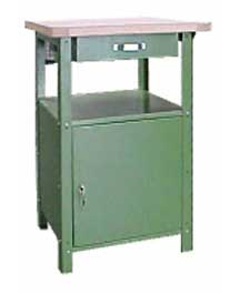 Pomocniczy stolik warsztatowy o małych gabarytach. Nogi wykonane są z blachy stalowej o grubości 2 mm, pozostałe elementy z blachy o grubości 1 mm. Elementy metalowe malowane lakierem proszkowym (kolor zielony RAL 6011). Stół nakryty jest blatem ze sklejki liściastej o grubości 30 mm. Szafka zamykana jest drzwiczkami z zamkiem cylindrycznym za którymi znajduje się jedna nie przestawna półka. Nad nimi umieszczona jest szuflada na prowadnicach rolkowych. Produkt do samodzielnego montażu.