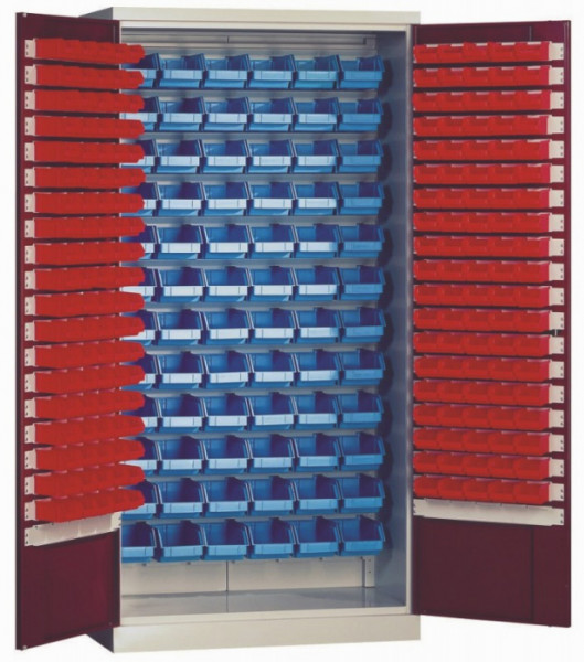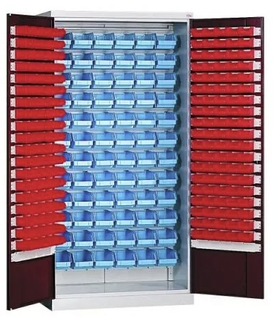 Wszystkie elementy szaf wykonane z blachy o grubości 1,0 mm. Drzwi ze schowanymi zawiasami zabezpieczone są zamkiem ryglującym je w dwóch punktach. Szafa wyposażona jest w listwy do mocowania pojemników warsztatowych o wymiarach: 224x144x108 (72 sztuki na ścianie tylnej), 119x77x56 (po 80 sztuk na drzwiach szafy). Szafa dostarczana jest z pojemnikami.