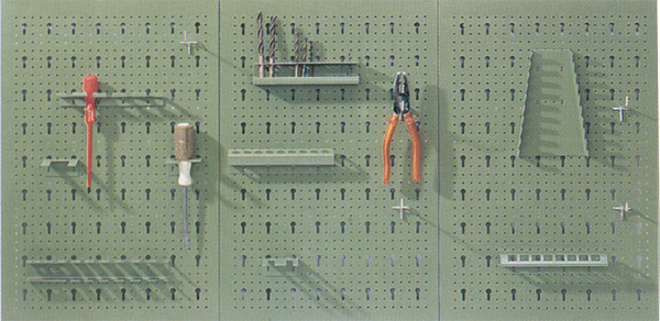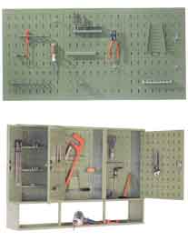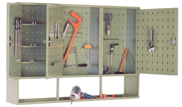 Ułatwiają utrzymanie porządku na stanowisku pracy i zapewniają wygodny dostęp do narzędzi. Ścianka składa się z perforowanych płyt nośnych, blaszanych uchwytów oraz haczyków z drutu. Szafki narzędziowe wykonywane są jako dwu lub trzydrzwiowe. Zabezpieczenie stanowi zamek cylindryczny z jednopunktowym ryglowaniem.Każda szafka wyposażona jest w uchwyty z blachy, haczyki z drutu i przestawne półki.