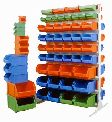 Przeznaczone do ustawiania w stos nie blokując dostępu do przechowywanych towarów. Wykonane z polipropylenu. Odporne na uderzenia, większość chemikaliów oraz temperaturę w zakresie od -5 do +60 st.C. Dostępne w kolorach: czerwony (RAL-3020), niebieski (RAL-5017), zielony (RAL-6024) i żółty (RAL-1016). Na stanie magazynowym posiadamy pojemniki w kolorach czerwonym i niebieskim.