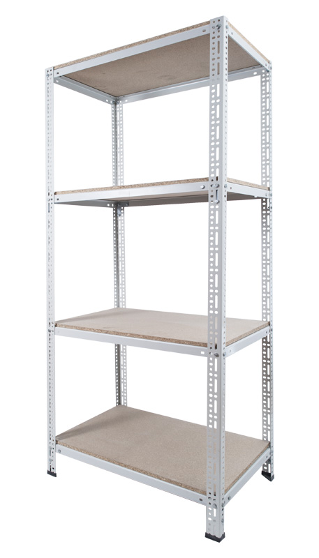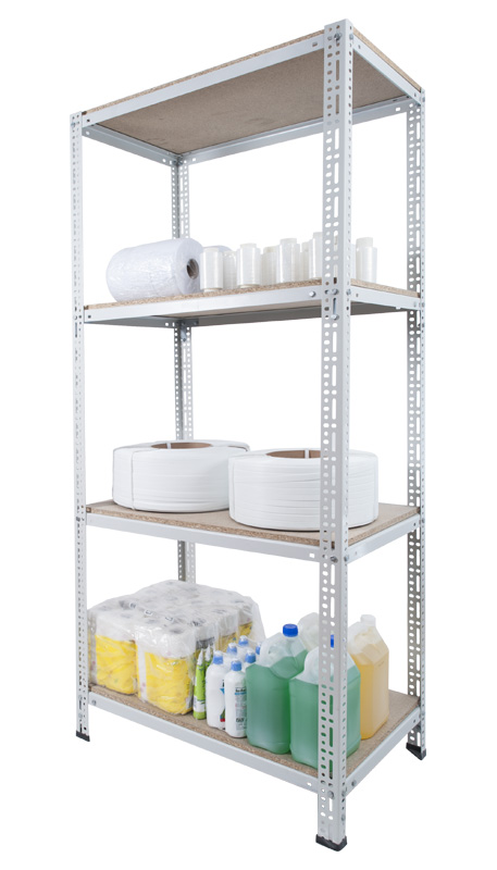 Słupy nośne regału wykonane są z kątownika perforowanego 55x35 x 2 mm i wyposażone są w stopkę z tworzywa. Stelaż pod półki z płyty wiórowej, wykonany jest zkątowników z blach 1,5 mm. Półkę stanowi surowa płyta wiórowa o grubości 16 mm. Metalowe elementy regału są lakierowane są proszkowo na kolor szary (RAL 7035). Udźwig całego regału 850 kg.