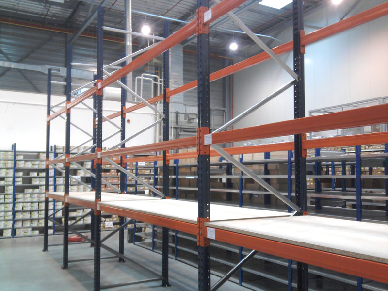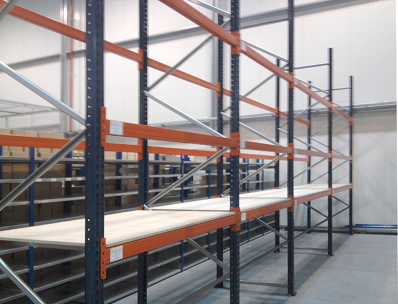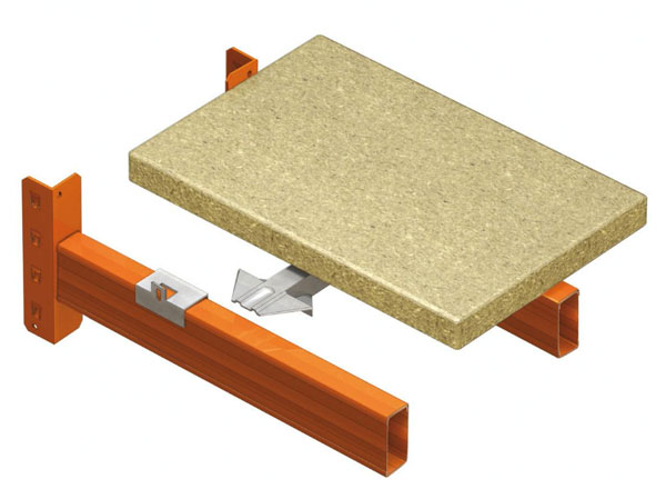 Regały paletowe można wyposażyć w półki z płyty wiórowej o grubości 22 mm. Takie wypełnienie półek umożliwia składowanie drobnych elementów i nie przeszkadza to w składowaniu palet. Płyty można zainstalować na bezpośrednio na trawersach a dodatkowo zabezpieczyć od dołu wspornikami a na krawędziach ogranicznikami, które będą zapobiegać zsuwaniu się płyty. Drugim sposobem montażu jest ułożenie płyt na specjalnych wspornikach. Płyty spoczywają na nich i są zlicowane z trawersami. Udźwig półki zależy od ilości zastosowanych wsporników.