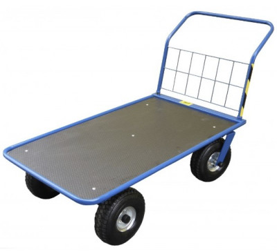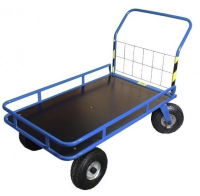 Wózki transportowe platformowe na kołach pneumatycznych pozwalają na wygodny transport towarów po nierównych nawierzchniach. Wszystkie elementy stalowe malowane są lakierami proszkowymi. Podłoga wykonana jest z wodoodpornej i antypoślizgowej sklejki impregnowanej. Koła polskie - łożyska wałeczkowe, czarna opona.