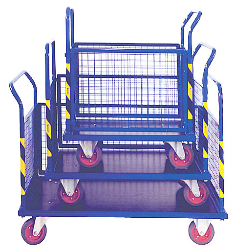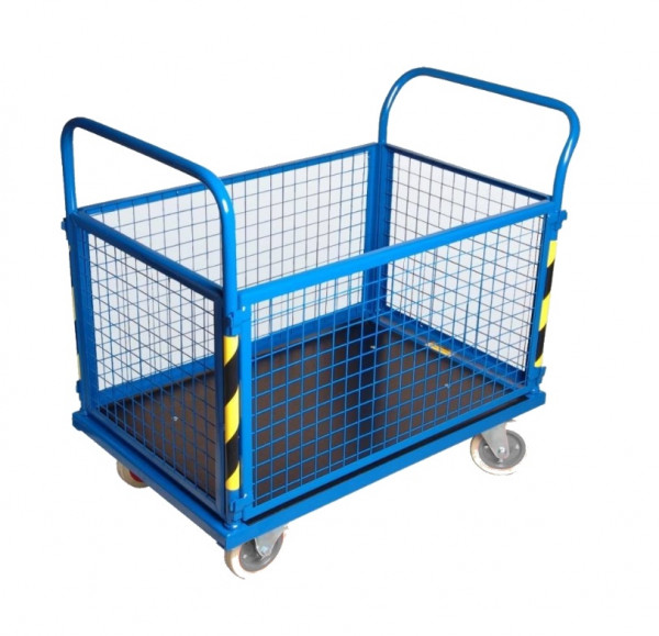 Wózki platformowe z burtami przeznaczone są do transportu towarów drobnicowych. Boczne ściany umocowane na specjalnych zaczepach ułatwiających ich szybki demontaż. Wszystkie elementy stalowe malowane lakierami proszkowymi. Podłoga wykonana z wodoodpornej i antypoślizgowej sklejki impregnowanej. Koła polskie - łożyska wałeczkowe, biała oponka.