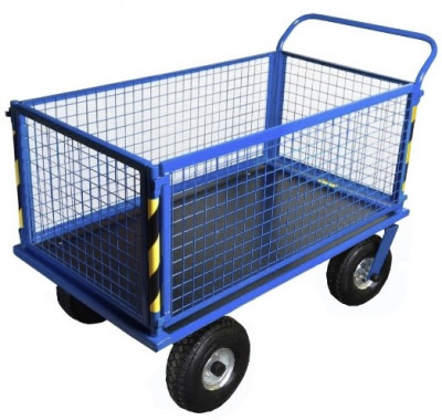 Wózki osiatkowane umożliwiają wygodny transport drobnych towarów. Burty siatkowe mają wysokość 520 mm. Boczne burty są łatwo demontowalne. Wszystkie elementy stalowe malowane są lakierami proszkowymi. Podłoga wykonana jest z wodoodpornej i antypoślizgowej sklejki impregnowanej. Koła polskie - łożyska wałeczkowe, czarna opona.