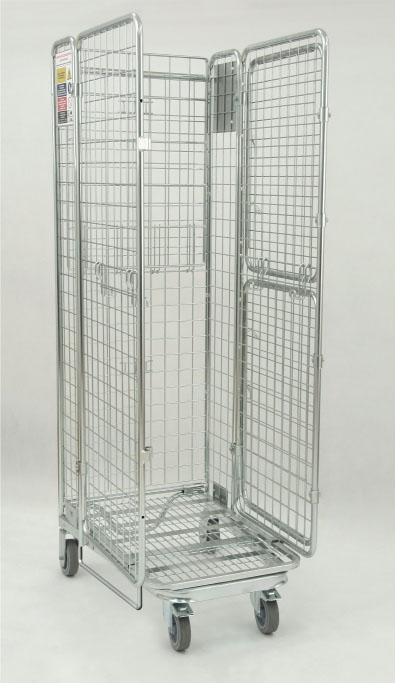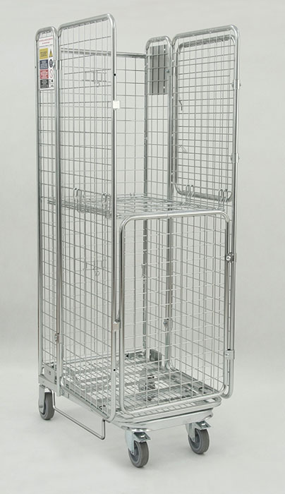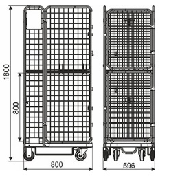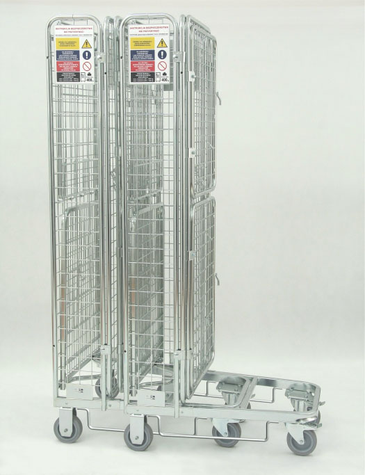 Wózki transportowe przeznacznone do kompletowania i przewozu towarów drobnicowych. Kontener posiada dwa frontowe drzwi uchylne (górne i dolne), które mogą być zamykane niezależnie od siebie tworząc ścianę frontową kontenera. Półka górna składana. Konstrukcja umożliwia złożenie kontenera i gniazdkowanie złożonych kontenerów.