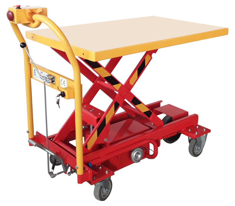 Wózek wyposażony jest w hydraulicznie unoszoną platrormę i elektryczny napęd jazdy. Podnoszenie platformy odbywa się za pomocą pompy nożnej. Płynność opuszczania zapewnia specjalny zawór sterowany dźwignią ręczną.