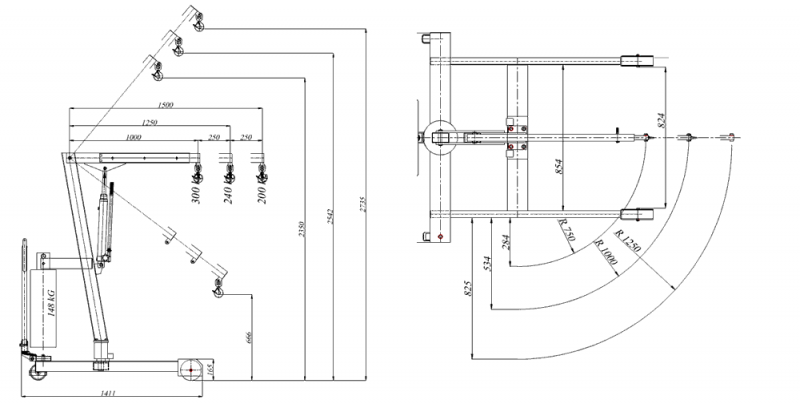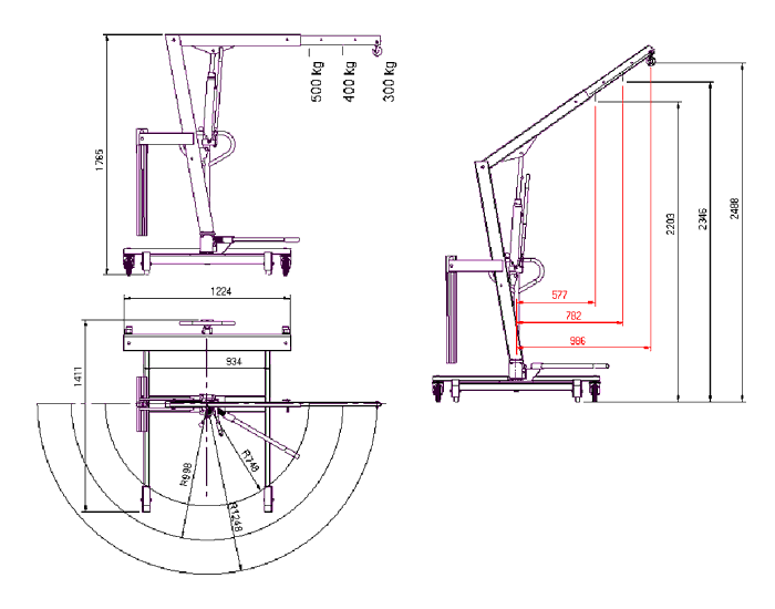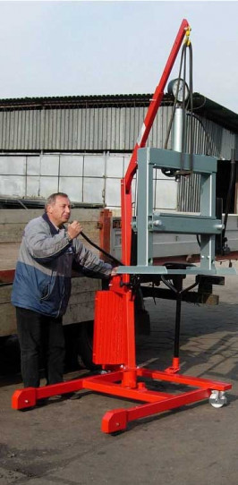 Przejezdny żurawie warsztatowy, którego obrotowe ramię usprawnia pracę. Podnoszenie ramienia odbywa się za pomocą jednostopniowej pompy ręcznej. Płynność opuszczania zapewnia precyzyjny zawór. Ramię posiada trzy stopnie regulacji długości. Przy maksymalnym wysunięciu ramienia udźwig maksymalny spada o połowę. Kółka skrętne wyposażone są w hamulce.